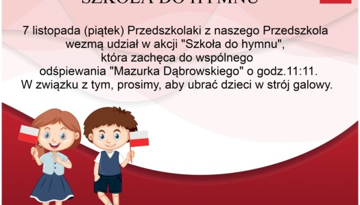 7 listopada 2025 r. o godz.11:11 Przedszkolaki wspólnie odśpiewają hymn "Mazurka Dąbrowskiego" w zwiazku z udziałem w akcji "Szkoła do hymnu...