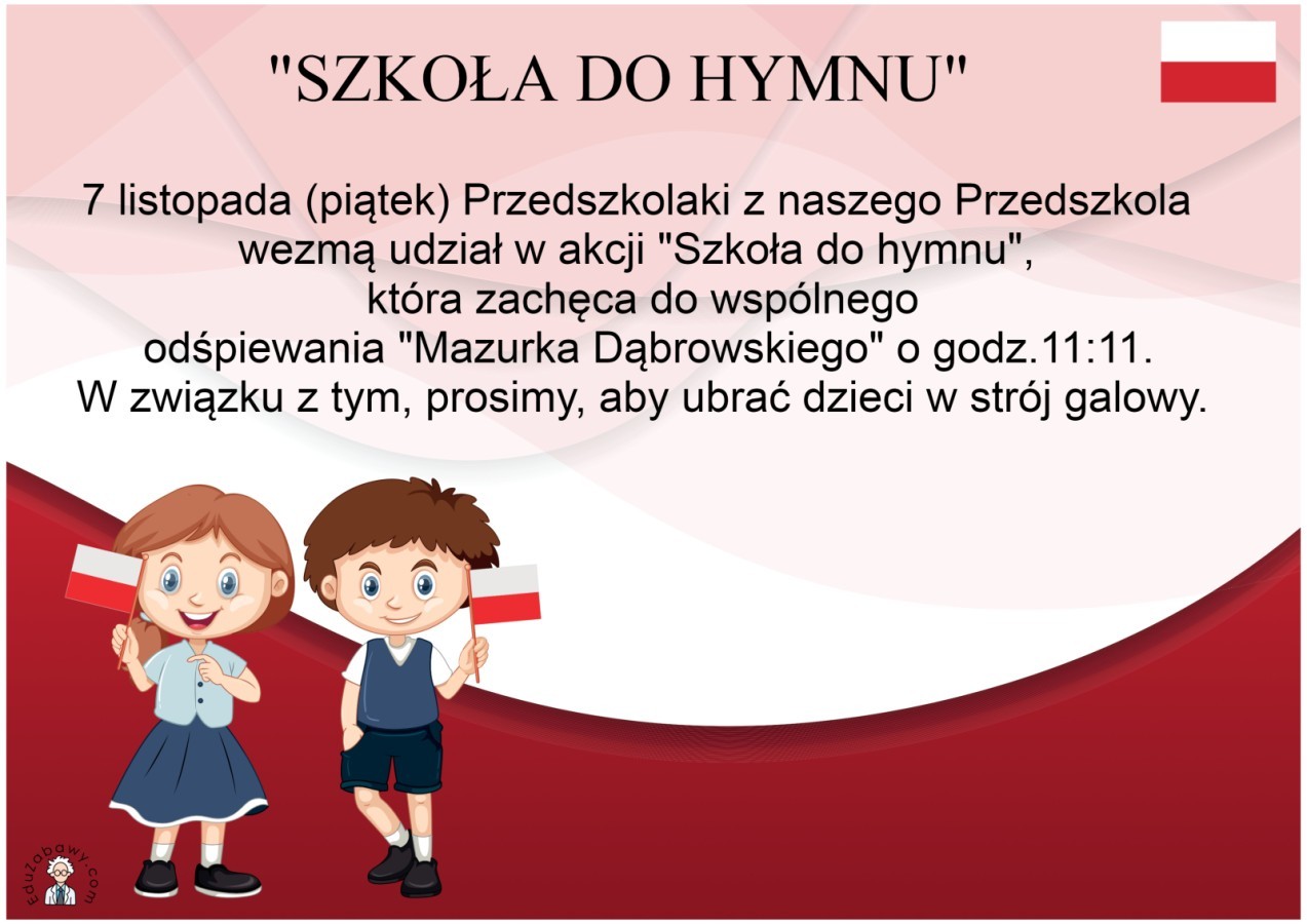 7 listopada 2025 r. o godz.11:11 Przedszkolaki wspólnie odśpiewają hymn "Mazurka Dąbrowskiego" w zwiazku z udziałem w akcji "Szkoła do hymnu".